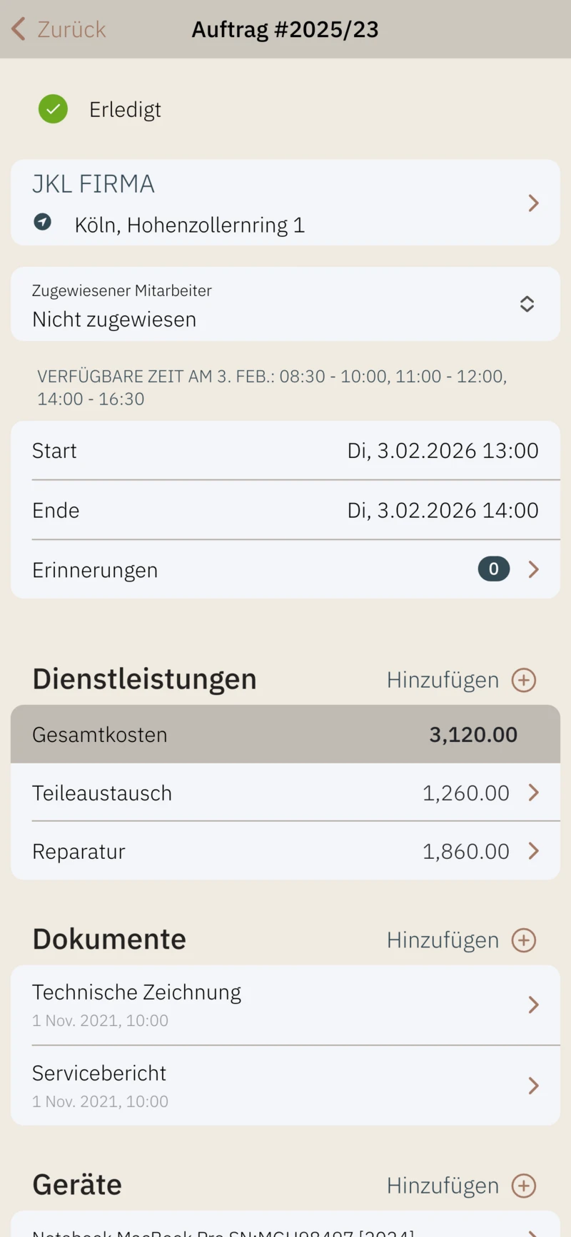 - Geräte dem Auftrag zuweisen,