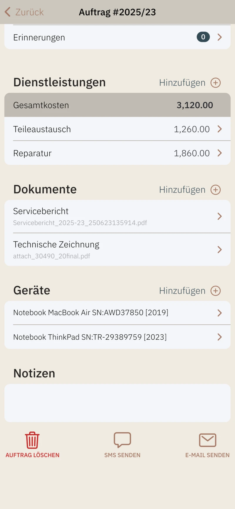- Notizen zum Auftrag speichern,